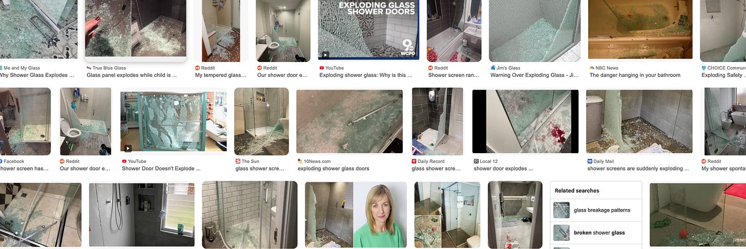 It turns out that these bathroom-based detonations happen ALL THE TIME. Has it happened to you? If so, why didn’t you mention it?! The internet is jam-bloody-packed full of fellow injured and traumatised people whose shower screen has detonated without warning.